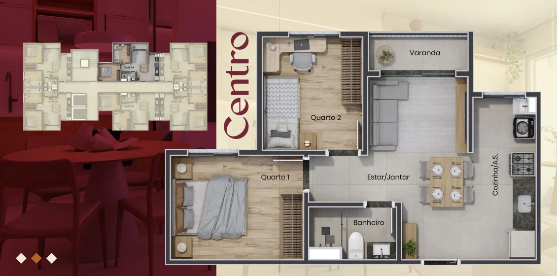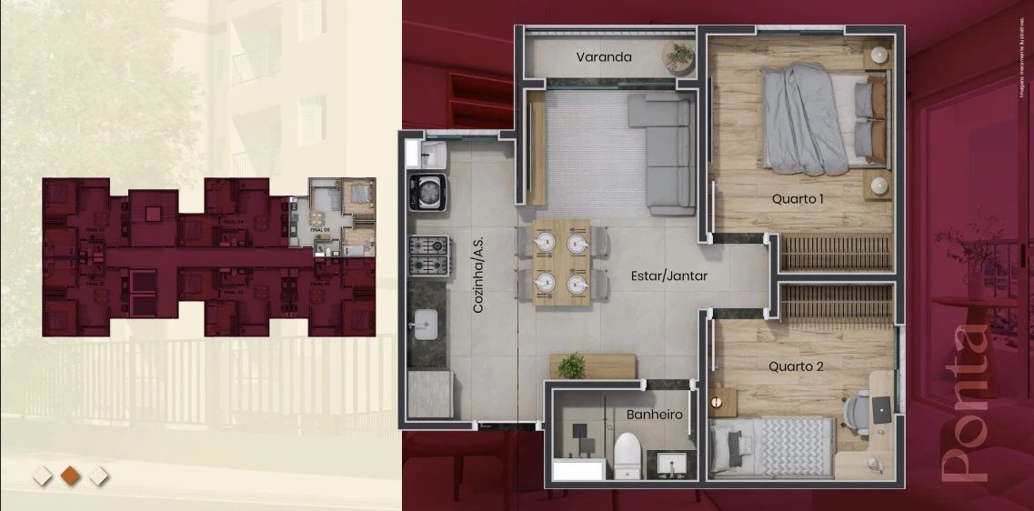 Os apartamentos foram projetados para oferecer funcionalidade e conforto, com metragens entre 45 e 47 m² e plantas inteligentes de 2 dormitórios. As unidades contam com ambientes integrados, cozinha funcional, excelente aproveitamento de espaço e opção de varanda, criando um ambiente moderno e acolhedor. Além disso, trazem diferenciais tecnológicos como fechadura eletrônica, tomadas USB e ponto para ar-condicionado, elevando o padrão do imóvel dentro da categoria.
