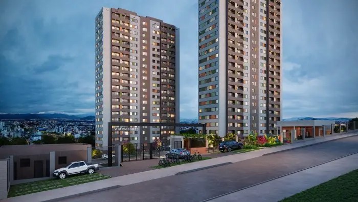 O projeto contempla apartamentos de 2 dormitórios, com varanda, sala integrada e área de serviço, geralmente com cerca de 38 m² a 43 m² de área privativa e 1 vaga de garagem por unidade ideal para quem busca primeira casa própria ou investimento em uma região em expansão.