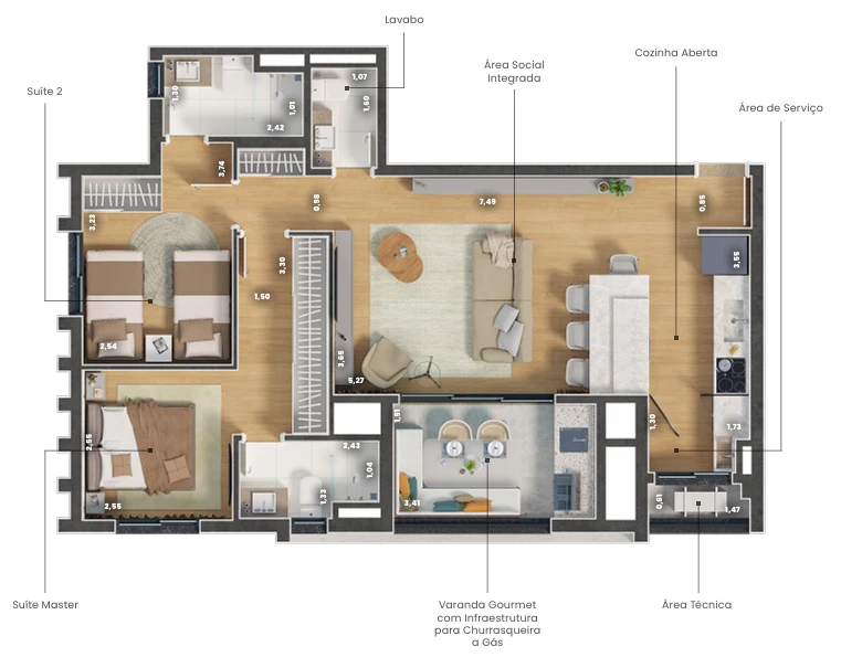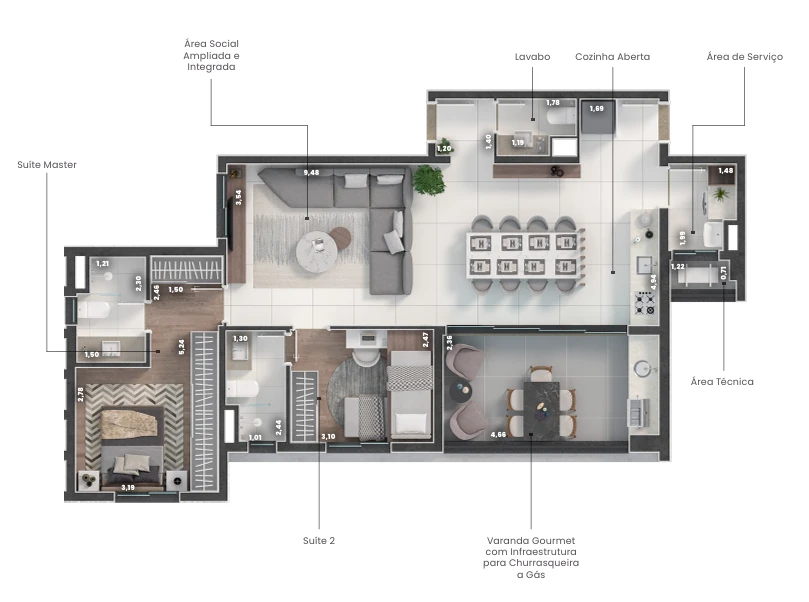 Os apartamentos foram projetados para oferecer conforto e praticidade no dia a dia, com opções de 77m² e 95m². As plantas contam com ambientes bem distribuídos, varanda gourmet, cozinha integrada, além de opções com 2 suítes ou 3 dormitórios (com suíte). Tudo pensado para valorizar cada espaço e proporcionar mais qualidade de vida.